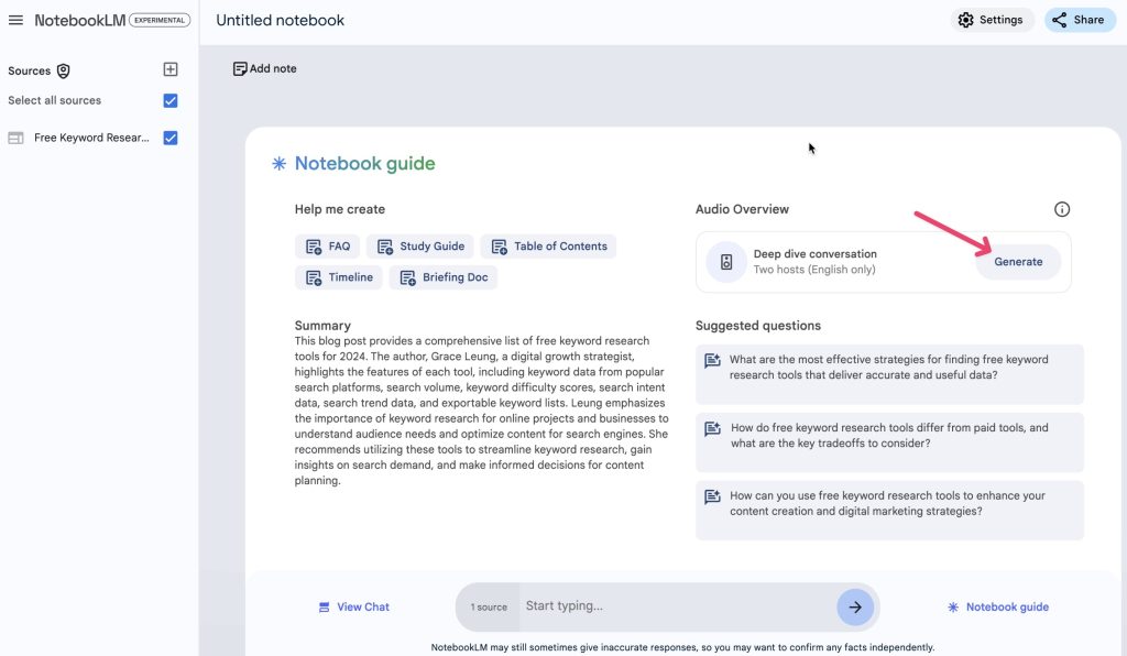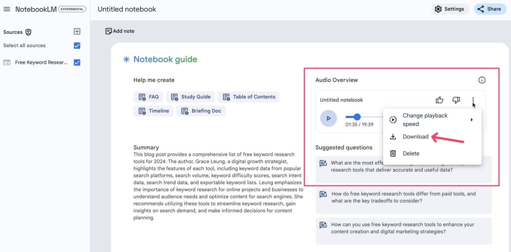 - Generate audio overview: Click “generate” under audio overview and download the resulting audio file.