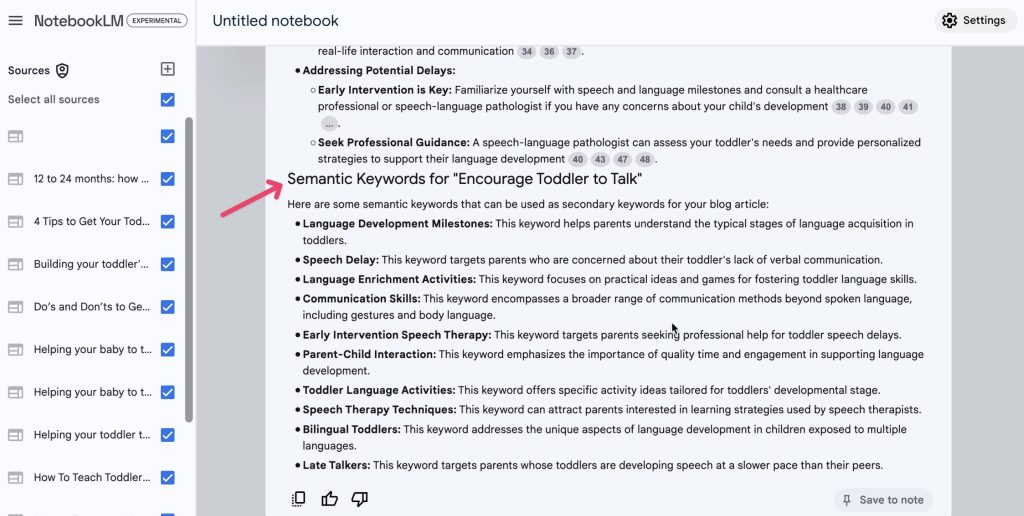 - Ask NotebookLM to analyze these top results and summarize the main topics covered. Additionally, request a list of semantic keywords to increase content relevance around the primary target keyword.