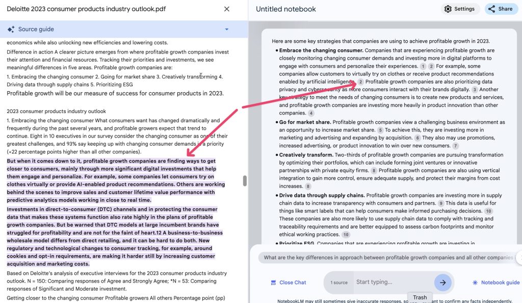 Users can easily select sources, pose questions, and maintain a consistent reference set without constant additions or deletions. The platform also offers built-in prompts for generating FAQs, study guides, or tables of contents to organize your database. Additionally, you can explore each source individually to gain insights on potential sub-topics as starting points. Note that there’s currently no chat history retention between sessions. Any information will be lost once a new session begins, so it’s advisable to save important notes.