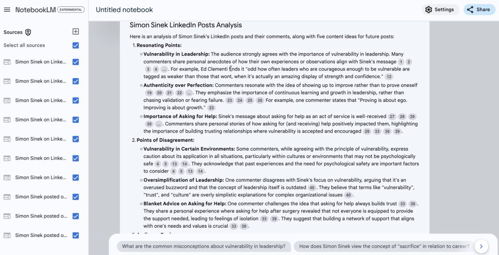 - Generate content ideas: Request NotebookLM to suggest 5 LinkedIn post ideas based on this analysis.