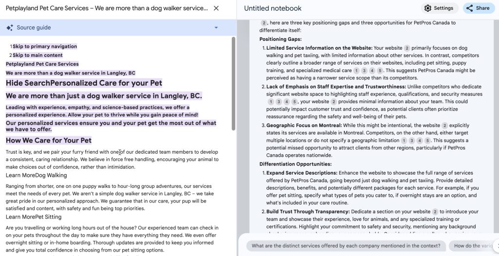 - Next, import your own website URL. For instance, if you’re the owner of “PetPros Canada”. Ask NotebookLM to identify 3 positioning gaps and suggest 3 opportunities for your website to stand out. Make sure to clearly state your website URL in the prompt for accurate referencing.