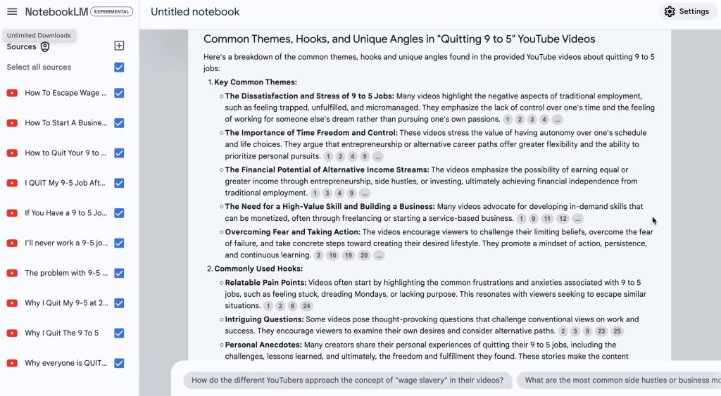 - Ask NotebookLM to summarize the key common themes across these videos, analyze the commonly used hooks, and identify unique angles used in each video.