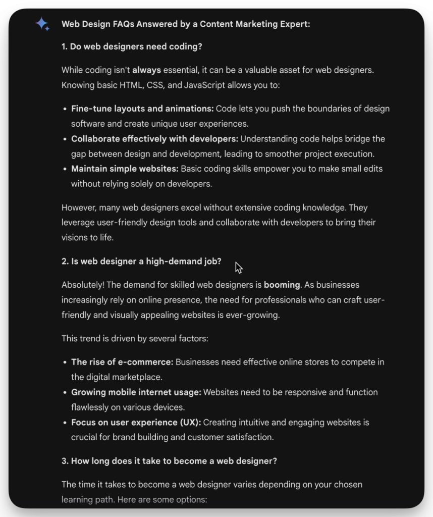 Now, you can go back to Gemini and ask it to generate a few paragraphs answer for each question by pasting the 5 selected questions. Remember to give a bit of context to Gemini about what these questions are about to ensure a more accurate output.