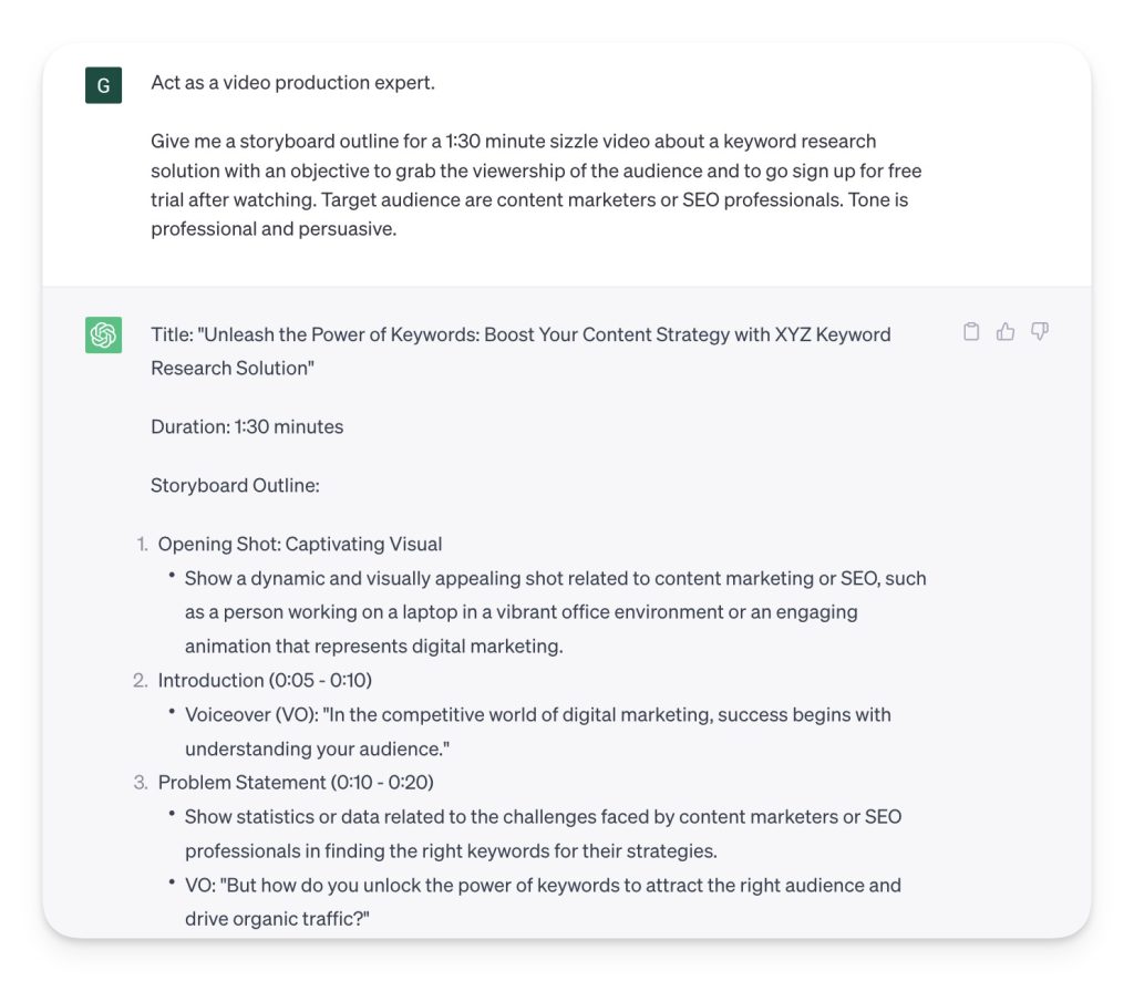 ChatGPT will give you the details and voice-over by each scene, of course you will need to adjust to suit your product, brand tone and style or if you really need a VO. You can even hint it with more product features to get some more storyboard ideas.