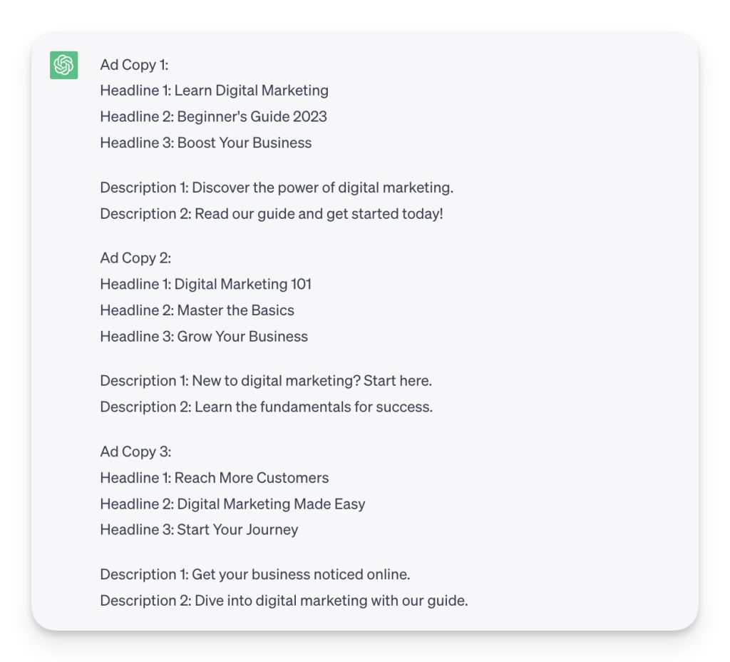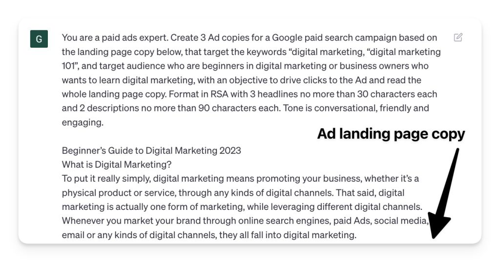 ChatGPT is very powerful in generating different ad copy ideas and I find it useful if you just want some quick ideas out of the box and get ad variations. You can try the below prompt, asking for ad copy ideas based on your target keywords, the Ad format, and the desired tone. The important thing here is to paste the landing copy in your input, so ChatGPT can generate output that really match your Ad landing page.