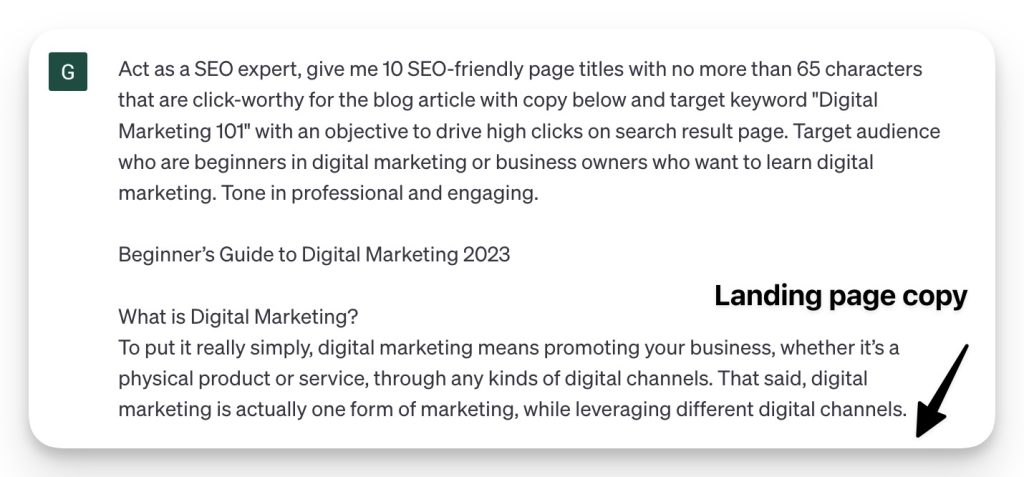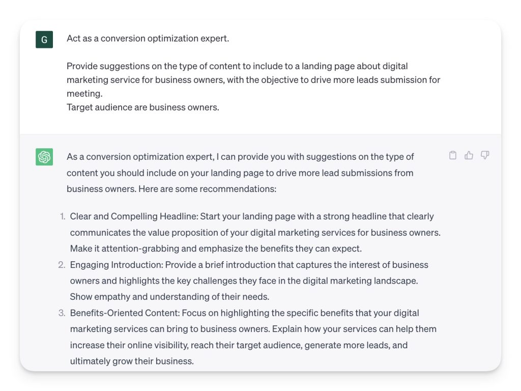 This is a little tricky, because ChatGPT 3.5 can’t access a landing page URL to provide suggestions, but we can ask it to provide what kind of content to include for conversion improvement. See this example, include your business, target audience and the specific action to take.