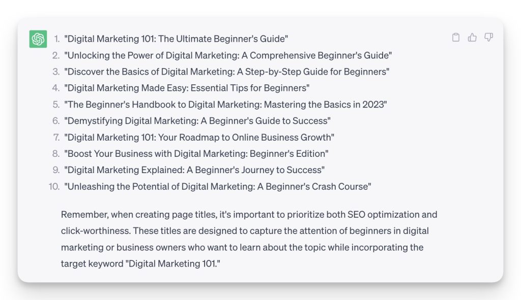 With ChatGPT, the job of crafting good SEO page title that usually takes an hour can now be shorten to a few seconds only. You can further modify the prompt a bit by specifying your requirement, like any keywords must include or must avoid, or to give input some relevant keywords for it to brainstorm more page title ideas out of the box.