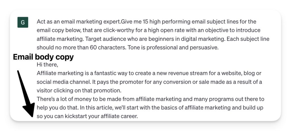 When it comes to email marketing, email subject will almost determine the success or failure of your email campaign because people will only open your email if it’s click worthy. Below is the prompt I have used a lot in generating different email subject lines. Again, include your email body copy as part of the input to give more context to ChatGPT to draft more meaningful output.