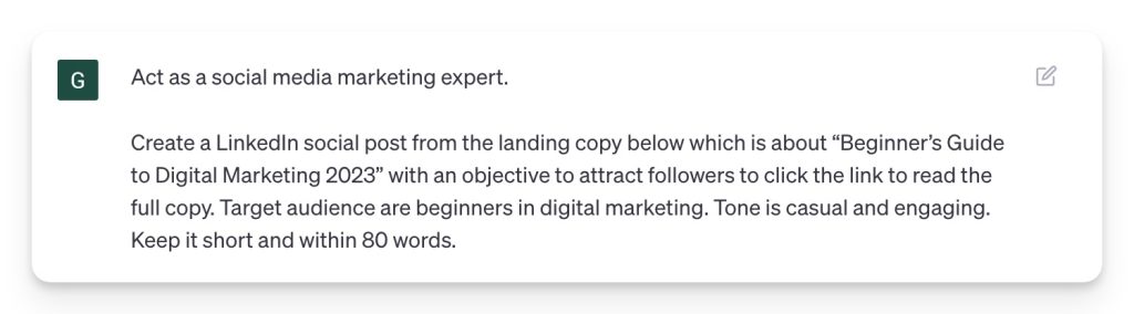 Copywriting for social media is another popular use case from ChatGPT. While just simply ask ChatGPT to “write me a social media post”, you want to link it back with a specific action that you want the target audience to take. Try below prompt framework, specify your social platform, desired action, the tone and your target audience, also include the landing page copy to get a good response.