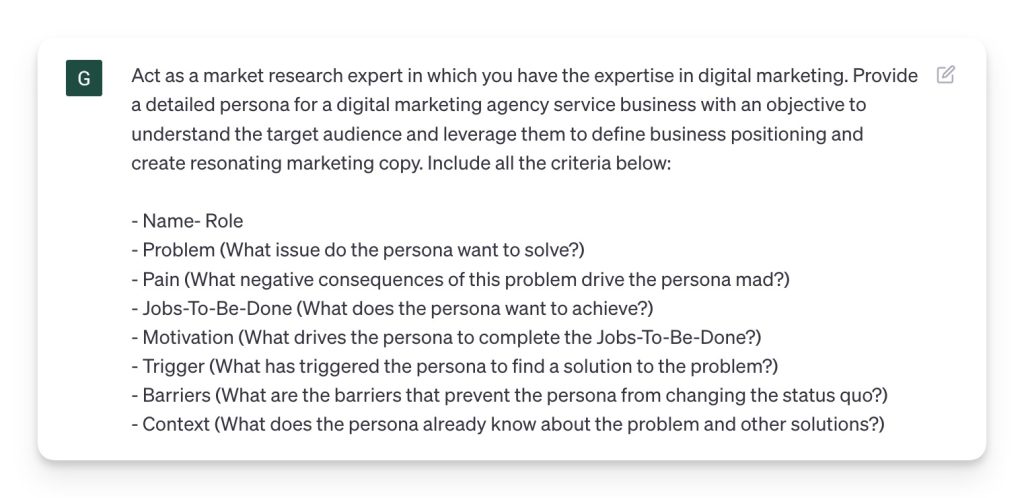 Let’s try with below example: include the business nature and industry, the important thing here is to ask ChatGPT to include the problem, pains, job-to-be-done, motivations, trigger, barriers, context for the persona which is a typical framework that you would need for persona statement.